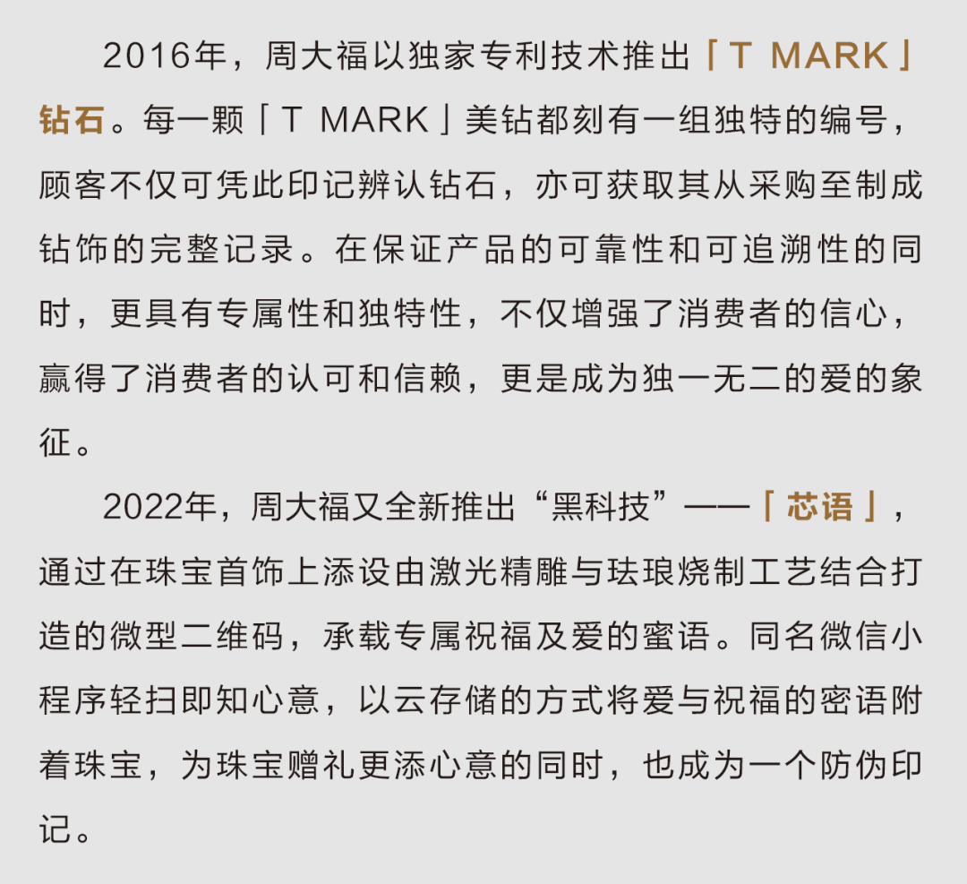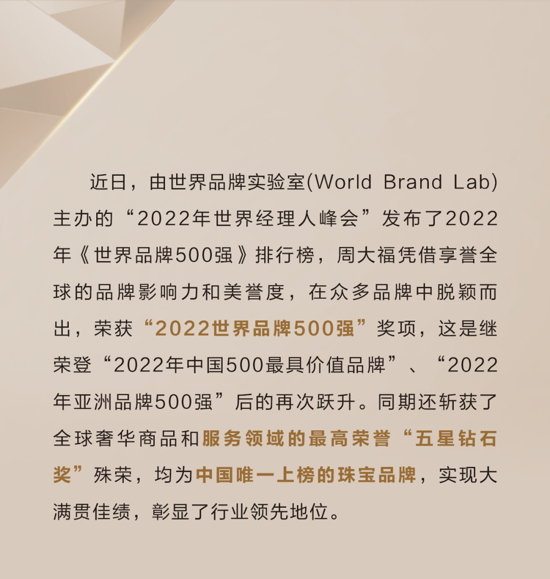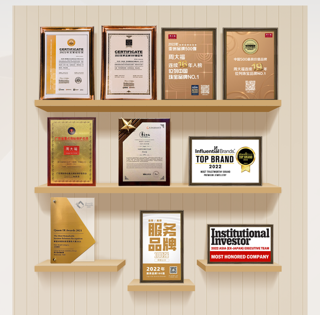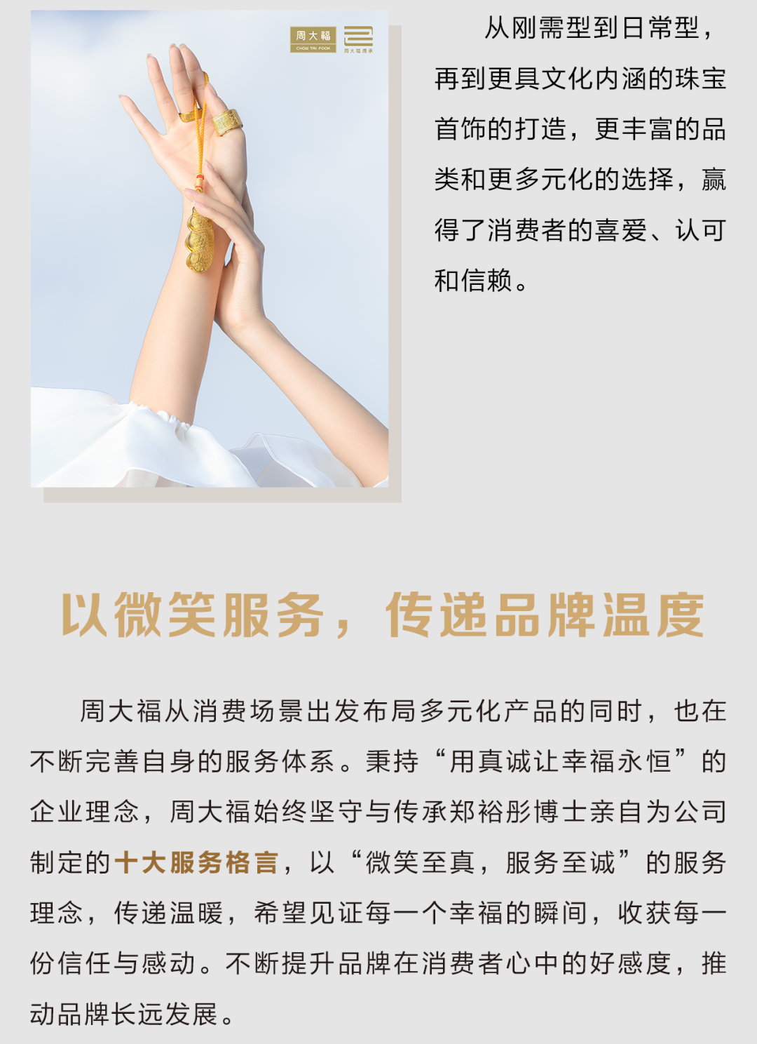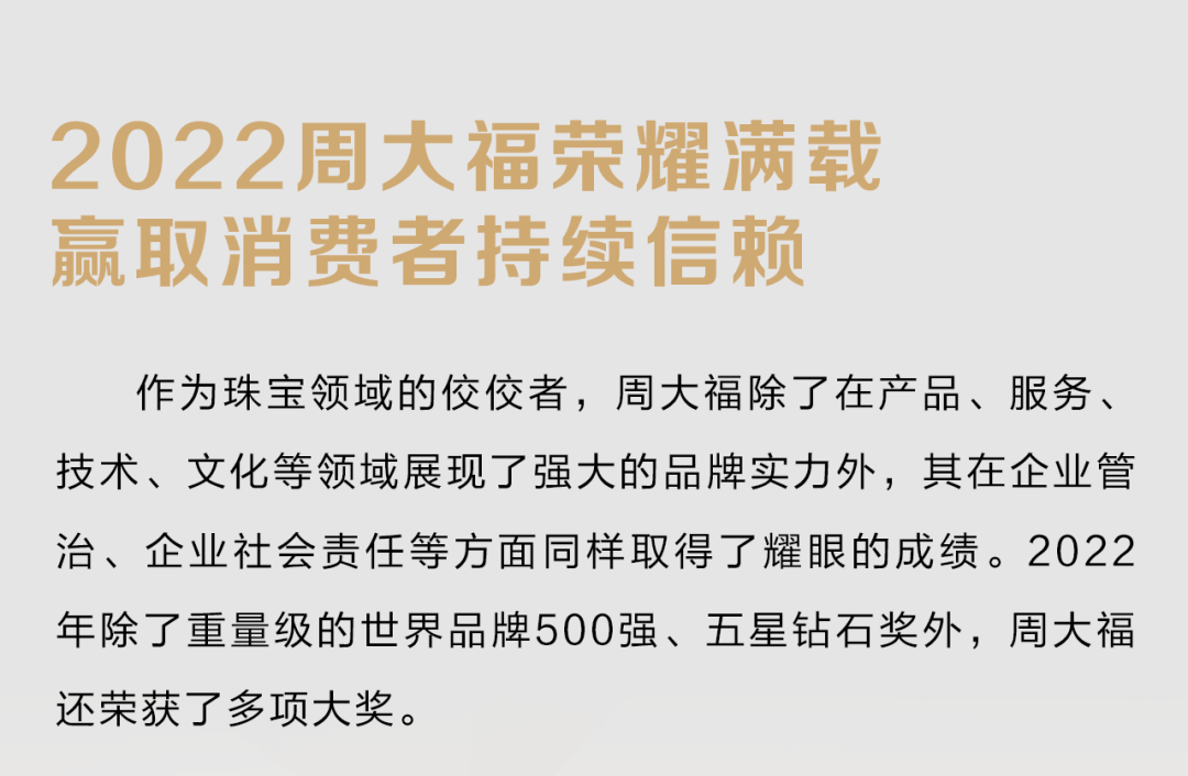 周大福品牌介绍:周大福珠宝集团有限公司;香港联交所股份代号:1929;于2011年12月在香港联合交易所主板上市,以成为全球最值得信赖的珠宝集团为愿景。集团标志性品牌「周大福」创立于1929年,广获认同为信誉及正货的象征,并以产品设计、品质与价值而闻名。集团及其标志性品牌的成功,从过去的悠久历史,体现出对创新和工艺的持久坚持,以及恒久抱持的核心价值「真诚•永恒」。
