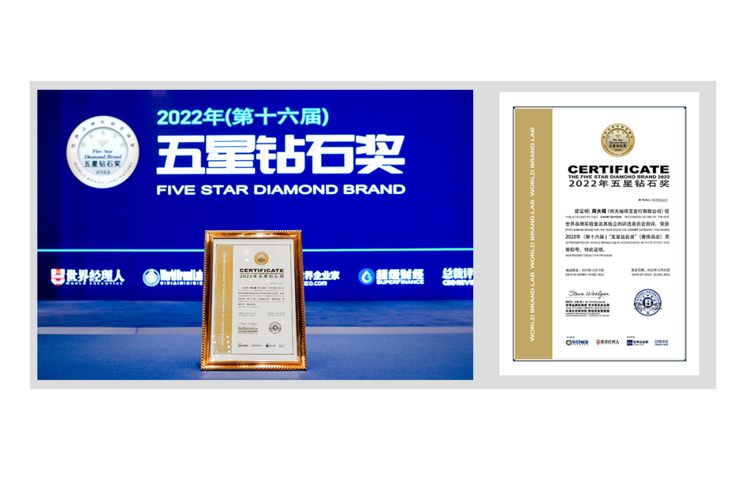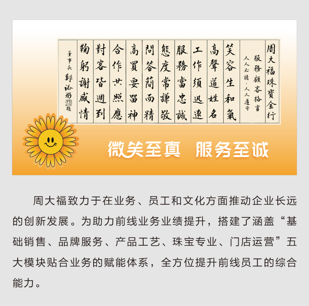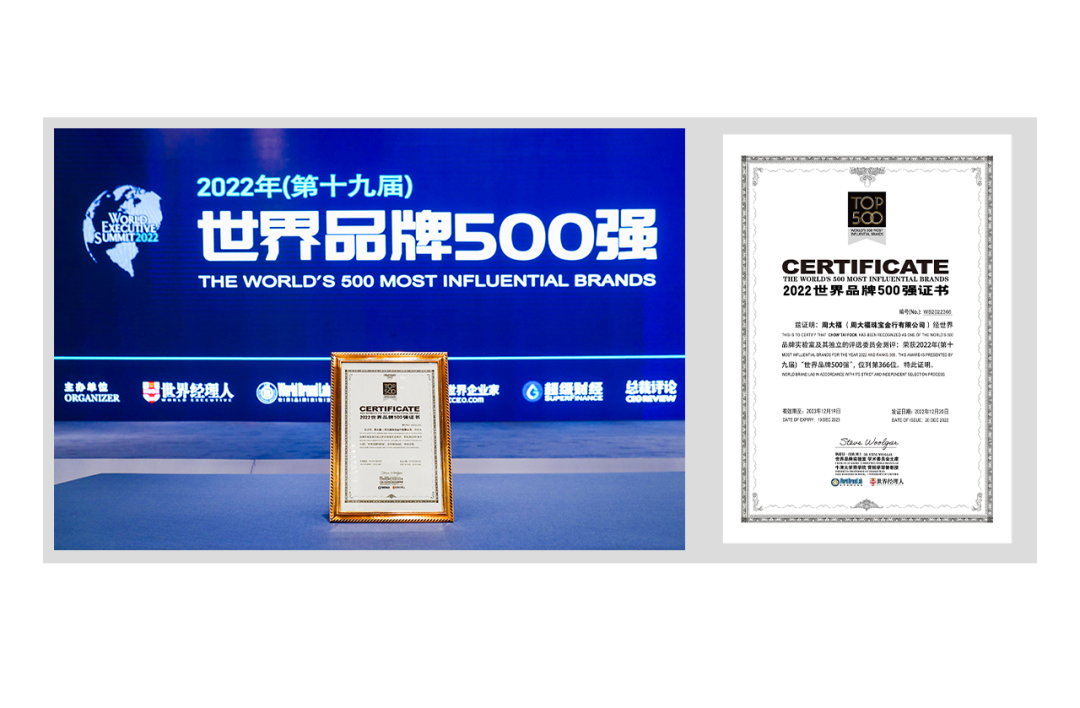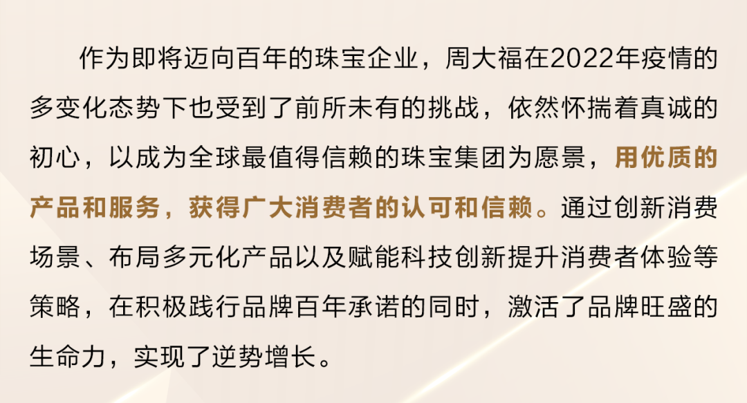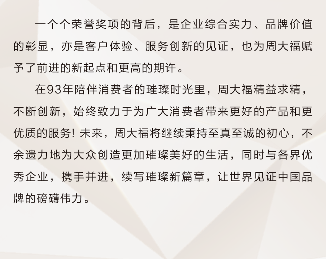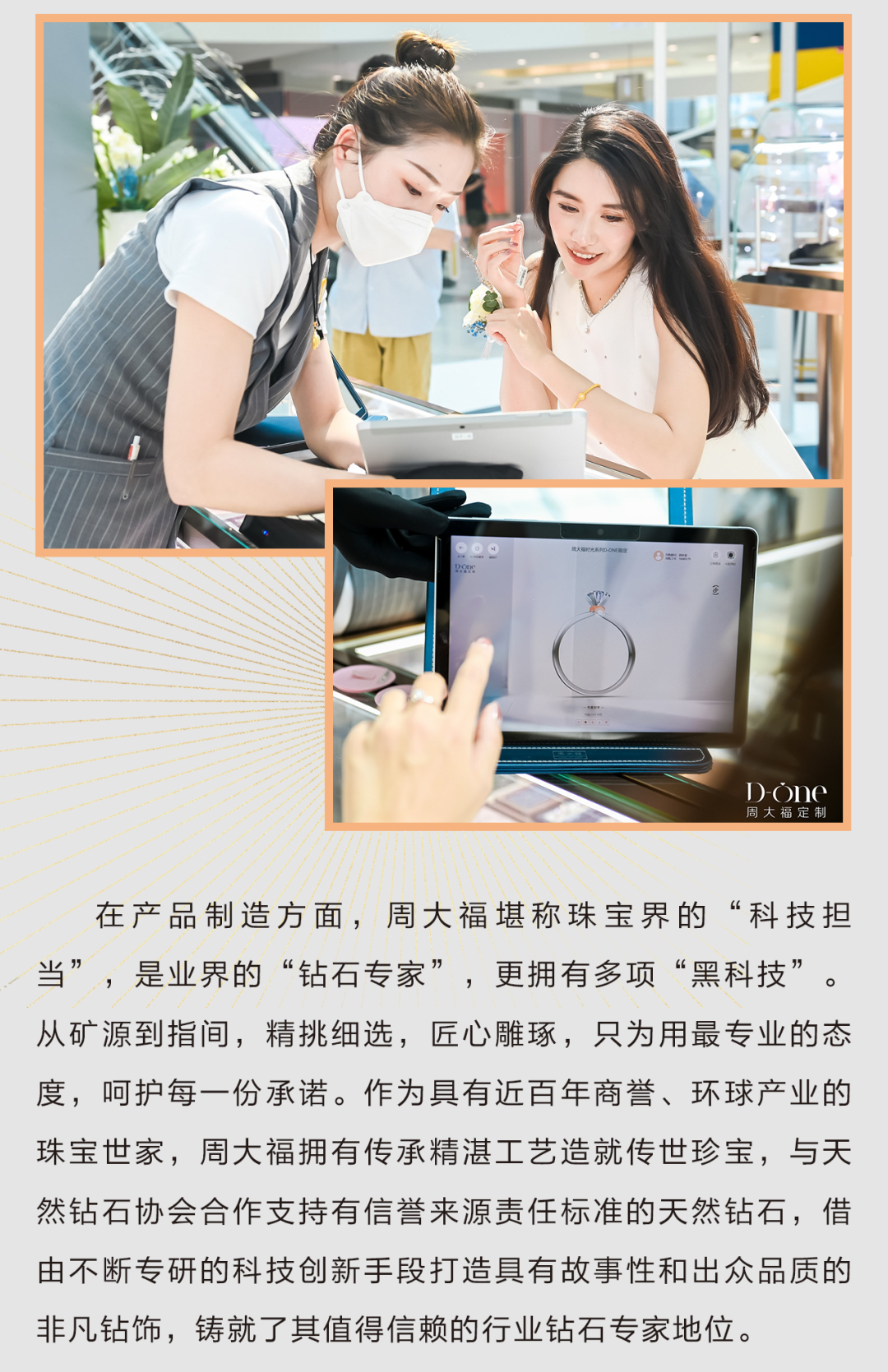 周大福品牌介绍:周大福珠宝集团有限公司;香港联交所股份代号:1929;于2011年12月在香港联合交易所主板上市,以成为全球最值得信赖的珠宝集团为愿景。集团标志性品牌「周大福」创立于1929年,广获认同为信誉及正货的象征,并以产品设计、品质与价值而闻名。集团及其标志性品牌的成功,从过去的悠久历史,体现出对创新和工艺的持久坚持,以及恒久抱持的核心价值「真诚•永恒」。