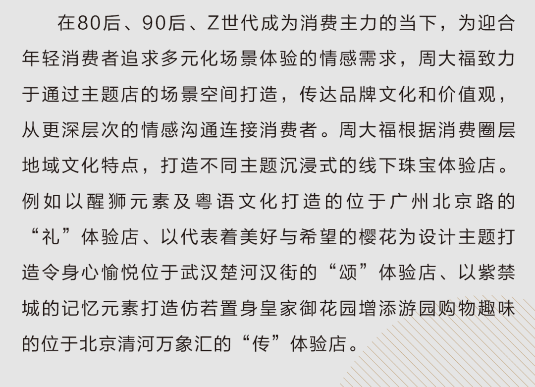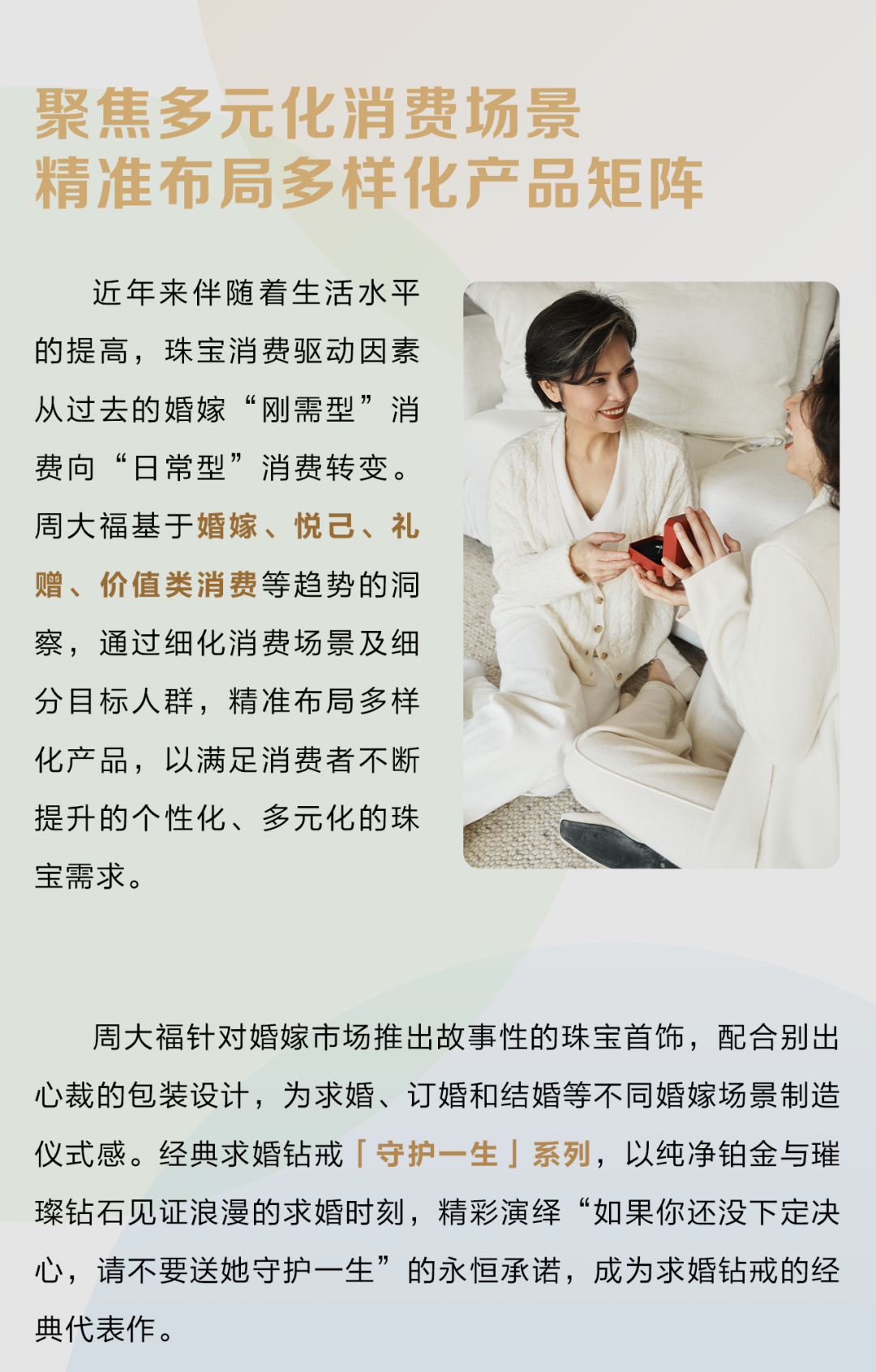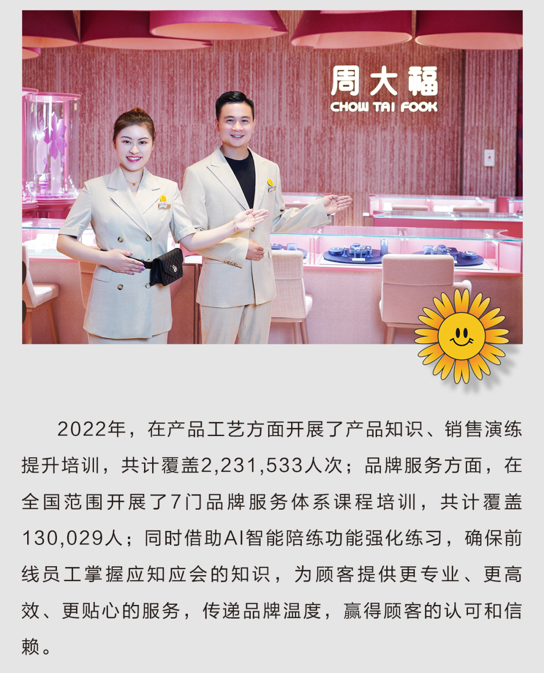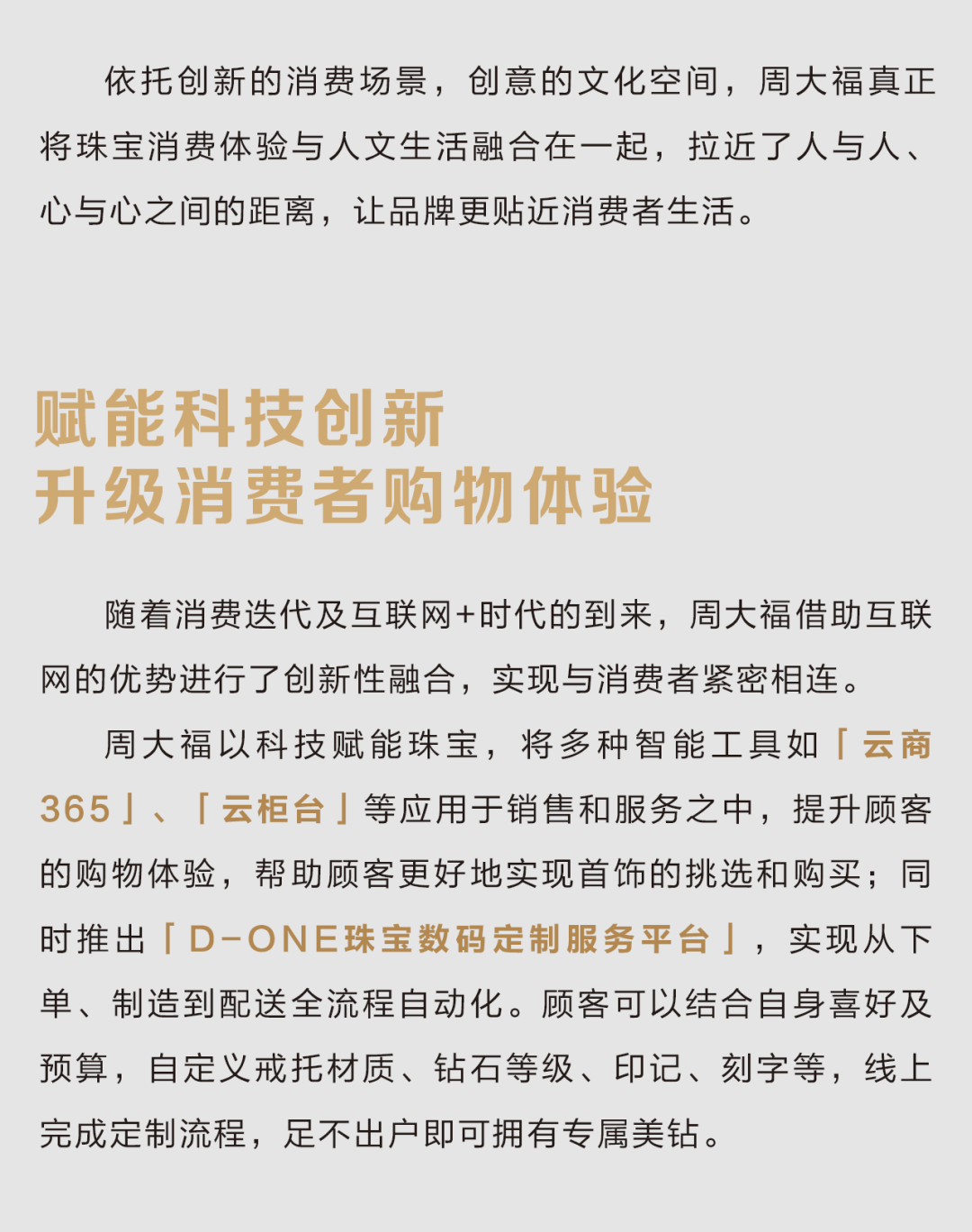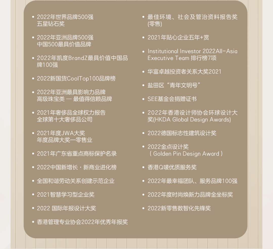周大福品牌介绍:周大福珠宝集团有限公司;香港联交所股份代号:1929;于2011年12月在香港联合交易所主板上市,以成为全球最值得信赖的珠宝集团为愿景。集团标志性品牌「周大福」创立于1929年,广获认同为信誉及正货的象征,并以产品设计、品质与价值而闻名。集团及其标志性品牌的成功,从过去的悠久历史,体现出对创新和工艺的持久坚持,以及恒久抱持的核心价值「真诚•永恒」。