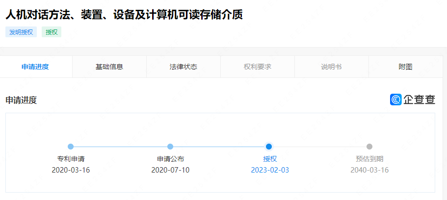 此外,在国内互联网大厂之中,根据企查查,2月3日腾讯科技(深圳)有限公司申请的“人机对话方法、装置、设备及计算机可读存储介质”专利已获得授权。