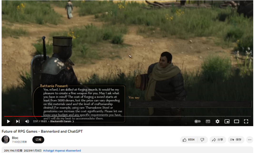 比如一个叫做Bloc的游戏玩家通过游戏mod接口,在《骑马与砍杀2》中嵌入了ChatGPT语言模型和自定义故事引擎。在ChatGPT的能力支持下,NPC“活”了,可以在与玩家的互动过程中,根据玩家输入的任意对话内容给出更鲜活生动的回应。