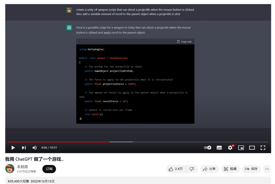 12月13日,独立游戏开发者BenBonk在YouTube上发布了一个名为“我用ChatGPT做了一款游戏”的视频,收获了超83万次播放。