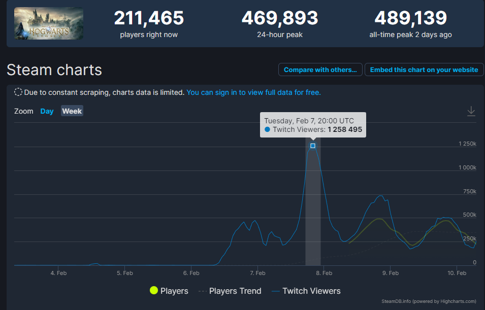 《霍格沃茨之遗》将于2月11日发售,但由于豪华版拥有提前72小时进入游戏的资格,根据SteamDB的数据显示,目前已经有超过20万的同时在线人数,而最高在线峰值甚至已经突破了48万,也是Twitch直播平台上的热门游戏。