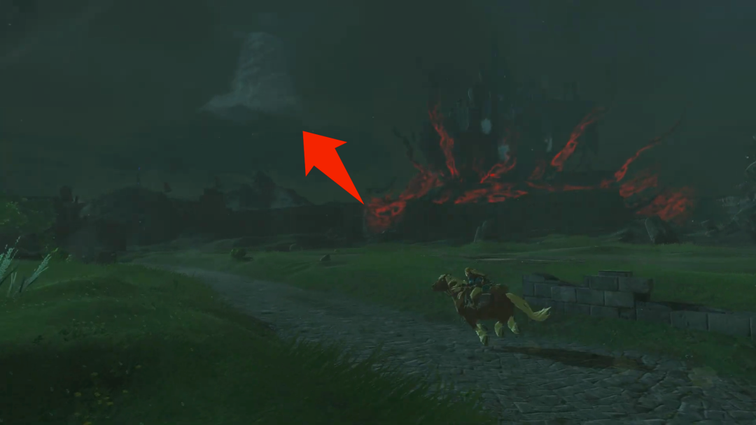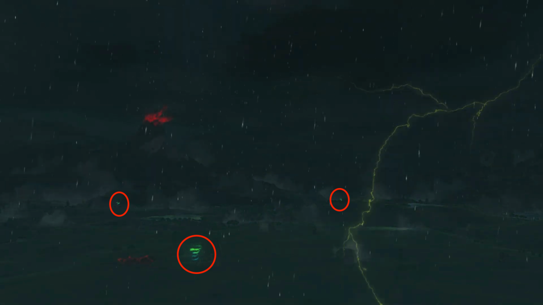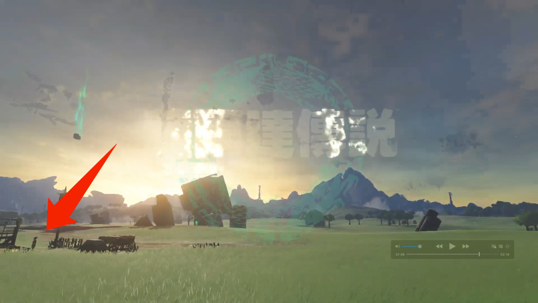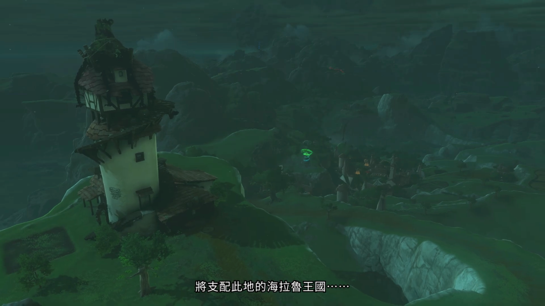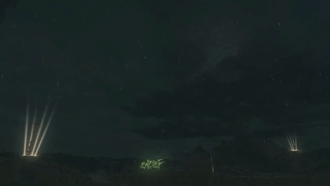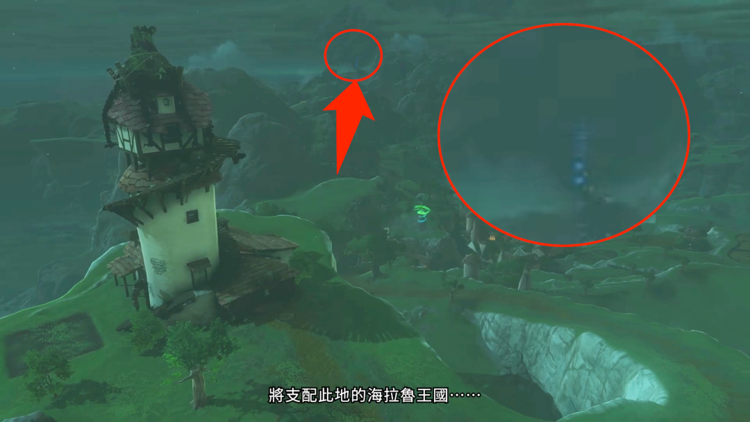 仔细看,上面这一幕中还藏着一个不易察觉的细节。如果你把图片调亮,放大,会很轻易地发现远处有一条竖着的蓝色光芒——就和《旷野之息》中的塔一模一样!