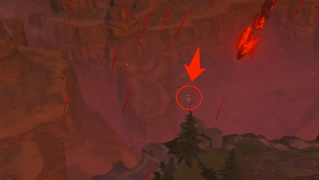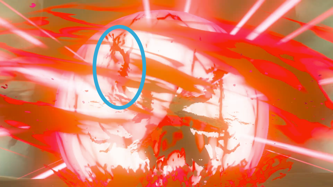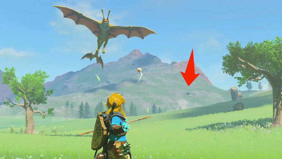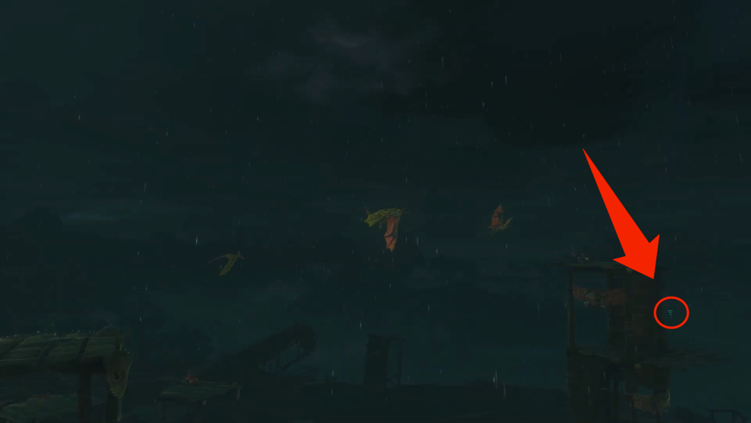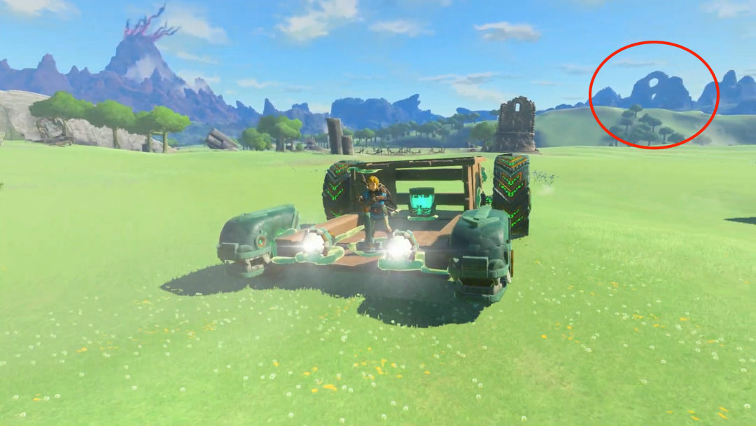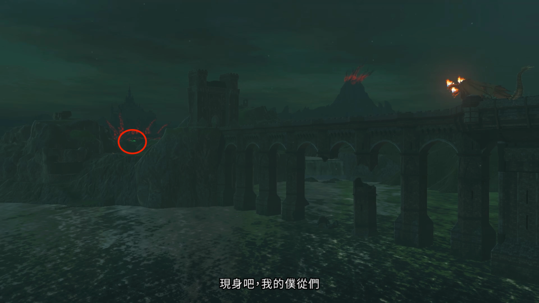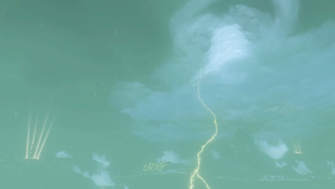 仔细看,上面这一幕中还藏着一个不易察觉的细节。如果你把图片调亮,放大,会很轻易地发现远处有一条竖着的蓝色光芒——就和《旷野之息》中的塔一模一样!
