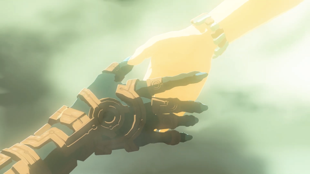 而从墙上的希卡族标志,和蓝色光芒来看,这套机械手臂装置应该是友军设施。或许是用于清除林克身上的“污垢”?随着冒险身上会变脏这一设计,在《异度神剑3》中已经进行了实验,或许在本作中会变成一个更有意义的玩法。