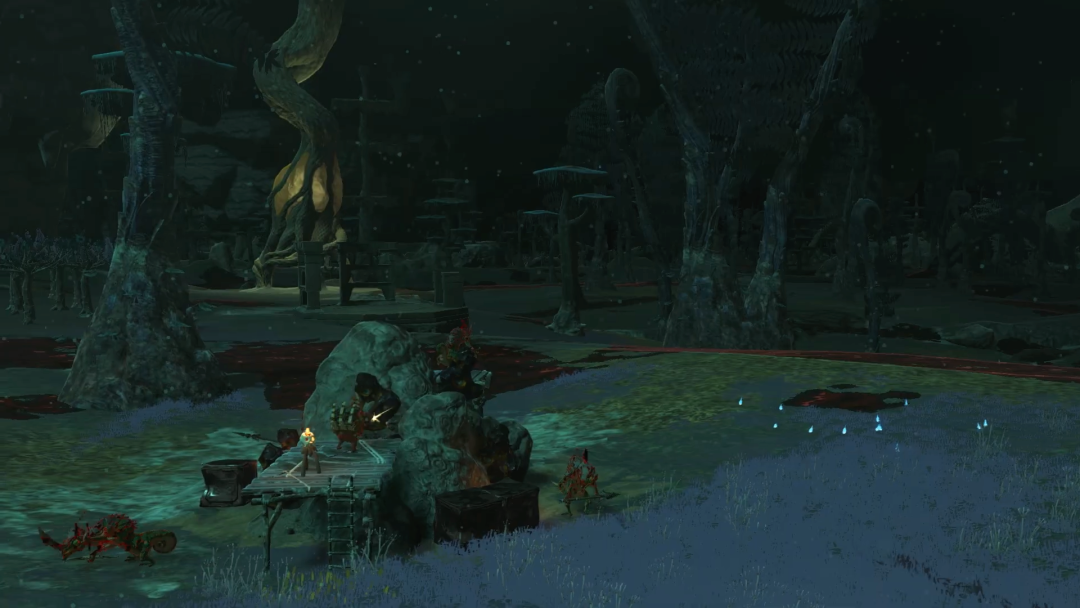 这一幕如果大家仔细听左边怪物的叫声,和中间怪物敲击矿石的声音,会发现它像是在洞窟等环境下发出来的,能听到一个比较弱的回声。