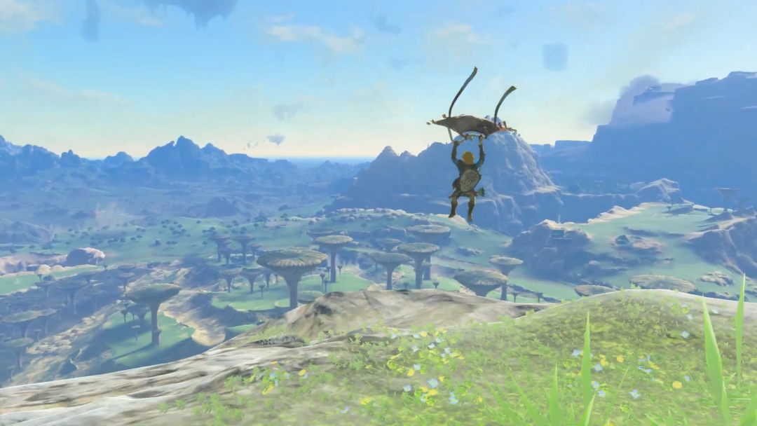 不知大家是否觉得,这一幕中林克从起跳到开伞,视觉和物理效果都和《旷野之息》大不一样,几乎是在跳起来的瞬间就开伞了,而没有一个短暂下落的过程。