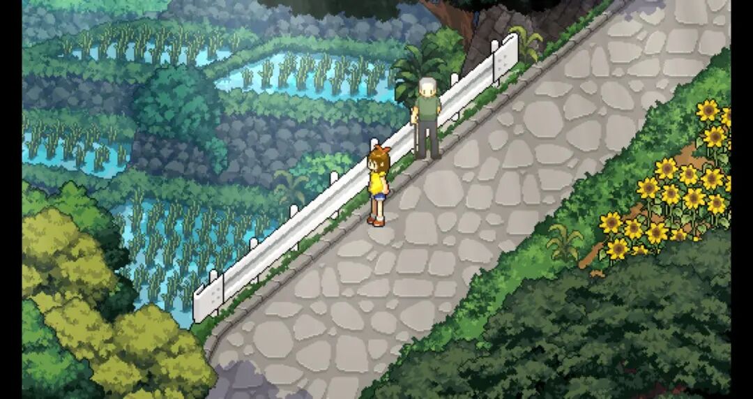 完全重制的美术风格与游戏场景:水渠与花田构成了“美丽”阿座河村的一角