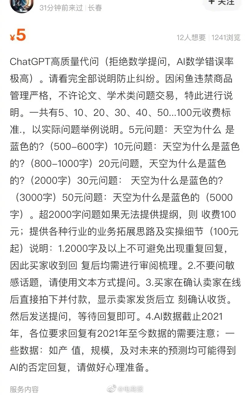 但另一方面,ChatGPT在国内的迅速走红,也诱发了一些投机者想要趁机跟风捞一笔的心态。他们抓住了国内用户注册OpenAI账号比较麻烦的机会,在电商平台上搞起了代注册和代聊天提问的生意。