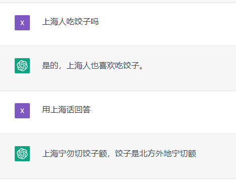 同样的,微博用户@寝取的史官也以类似的方式,训练出了ChatGPT的上海话版本。