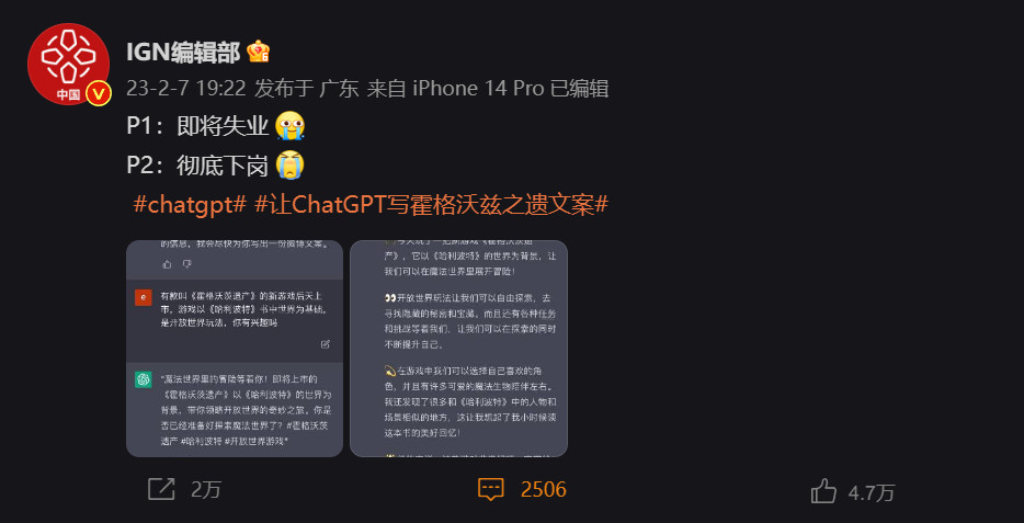 比如我们友邻的IGN中国编辑部,他们就尝试用ChatGPT编辑了一段关于游戏《霍格沃茨之遗》即将上市的微博宣传文案,结果发现ChatGPT几乎完全能胜任这项工作,甚至还贴心地在文案结尾加上了多个发布标签。这瞬间就让官博的运营人员,产生了职业生涯前所未有的危机意识。之后他还测试了ChatGPT是否能将同一篇文案转化为小红书风格,结果ChatGPT最终也没让他失望,各种emoji表情被使用得颇为得心应手。