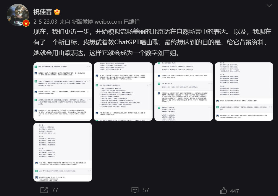 之后,祝佳音老师便开始一本正经地研究如何“戏耍”ChatGPT。除了向它请教各种奇怪问题外,他甚至开始引导ChatGPT以一种“老北京儿”式的口吻说话,并取得了阶段性成效。