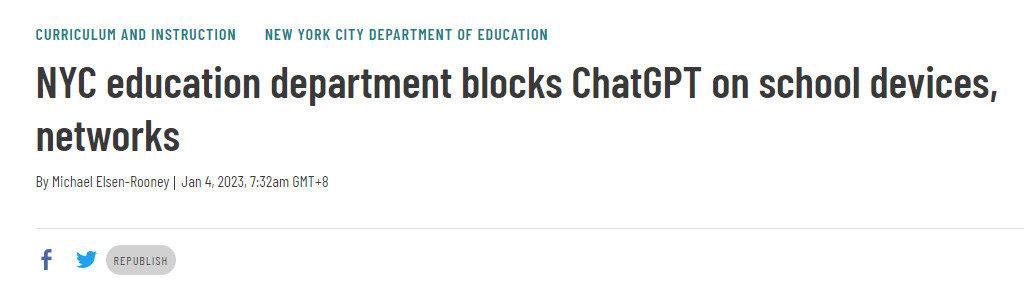 此外,国外也有调查数据显示,目前美国有89%的大学生,会选择用ChatGPT帮助他们完成作业。这虽然意味着,ChatGPT目前已经有能力处理一些初、高等教育中常见的学术问题,但对于教育这一行业本身来说,这并不能算是件好事。目前,美国纽约市教育系统已经宣布彻底“封杀”了ChatGPT。