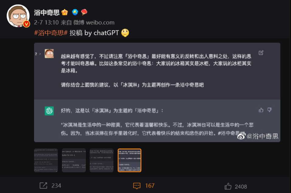 微博用户@浴中奇思,尝试让ChatGPT模仿自己的文案风格