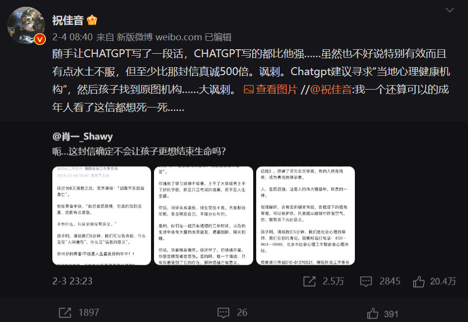 在我个人的微博关注列表里,最先开始用ChatGPT“整活”的,是触乐网的创始人祝佳音老师。他在看过某篇关于最近颇受关注的胡鑫宇案的自媒体文章后,突发奇想让ChatGPT也以书信的形式写一段话,证明了即便是AI也比原文作者更会写文章。