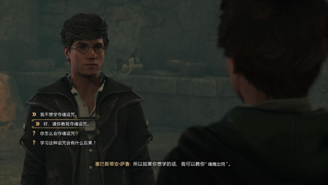唯一值得肯定的是,在少数几个与重要同伴展开的支线任务中,游戏在叙事层面表现出了不错的深度——尤其是在对角色的情感刻画上,这些支线剧情所塑造的角色,相比其他支线任务中的站桩聊天NPC,会显得更加真实且令人动容。这里以蛇院学生塞巴斯蒂安的系列任务为例,在他的故事中,玩家不光要面对自己良心上“是否学习不可饶恕咒”的抉择,而且在推进剧情的过程中,玩家也将看到这位最初目的单纯的学生,是如何在黑魔法的诱惑下,不断突破自己内心的道德底线,走向无法挽回的痛苦深渊。