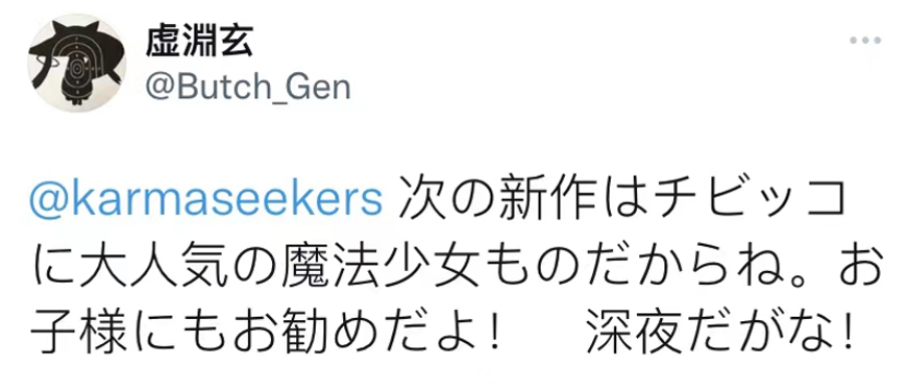 虚渊玄在动画开播前发的推文:下一部新作是小朋友们喜欢的魔法少女题材,也推荐年龄稍大的孩子观看,虽然是在深夜播出