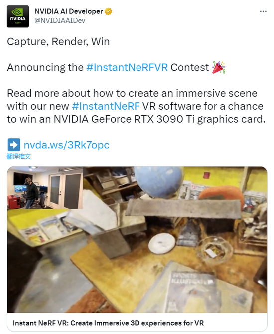 英伟达表示,升级后的 Instant NeRF 服务允许用户创建具有更高效率和更低成本的 VR 场景。用户转换其源 2D 图像后,可以在实时 3D(RT3D)引擎中将其作为渲染的沉浸式环境导入。