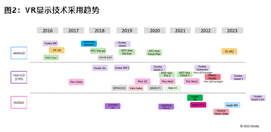 对于光学技术,Omdia 指出 TFT LCD 和 AMOLED 仍然是 VR 头显的主流。TFT LCD 和AMOLED 也是近眼显示器最成熟的显示技术。Micro OLED 具有比 TFT LCD 和 AMOLED 更好的视觉性能,但由于成本高,其市场份额仍然有限。
