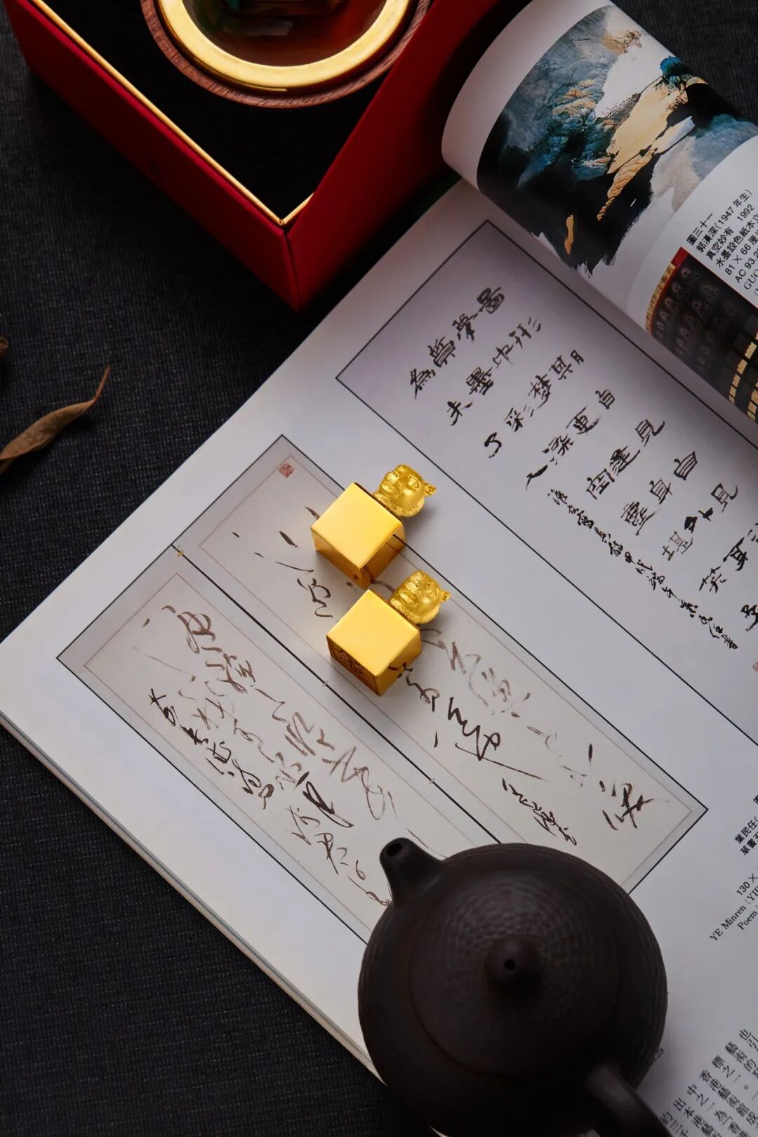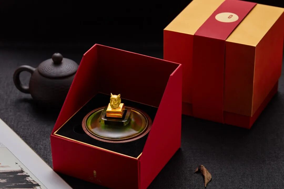 印章由多材质组成,虎首印纽以足银铸造,结合足铜印台,底座为琉璃材质,加上木质印泥盒,自成风格独特的一体,现代不失古韵。