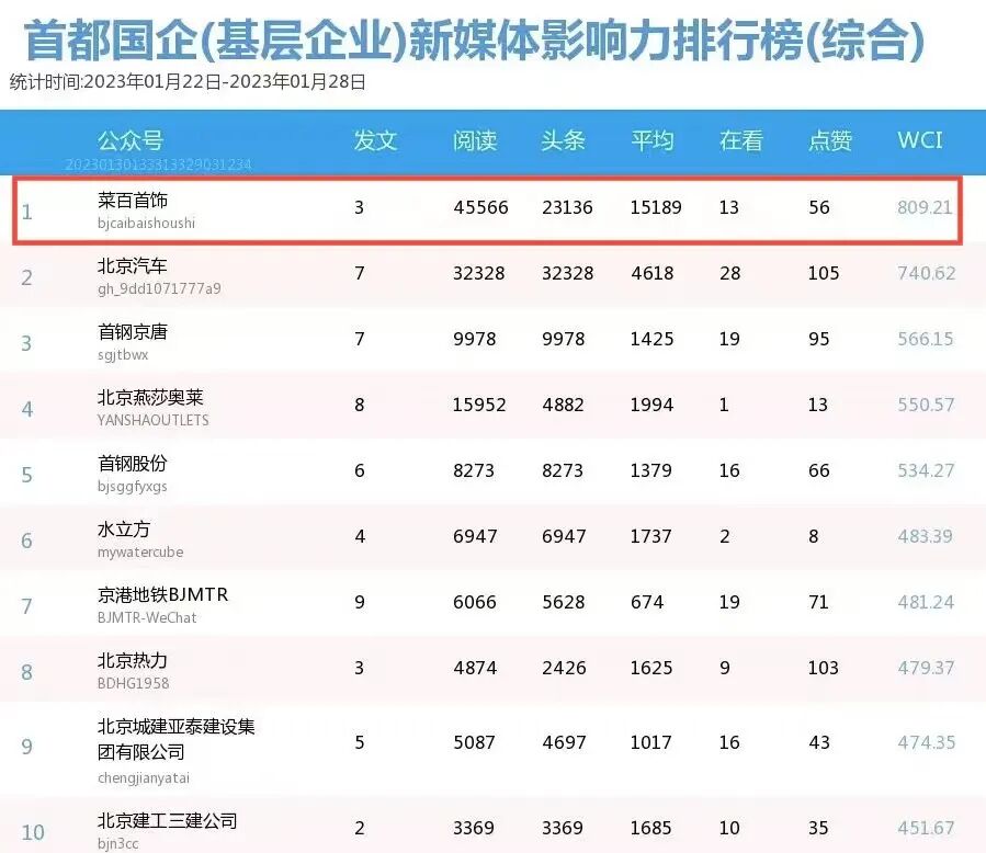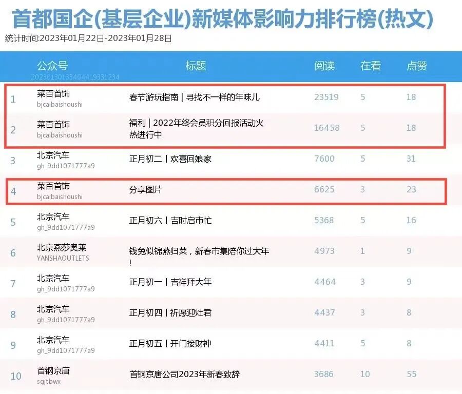 “国资京京”微信公众号1月30日发布【首都国企新媒体影响力排行榜】周榜,金融街资本所属菜百股份微信公众号“菜百首饰”的三条推文(如下图)位列首都国企(基层企业)新媒体影响力热文榜第一、二、四名,并斩获首都国企(基层企业)新媒体影响力综合榜第一名,为贺岁消费热潮增添了一份别样的年味儿。