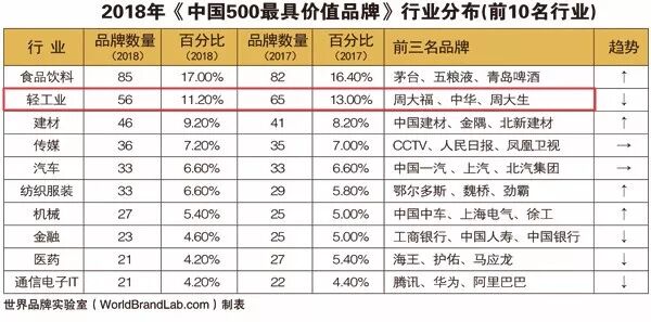 在2018年度《中国500最具价值品牌》排行榜中,轻工业共有56个品牌入选,仅次于食品饮料业的,入选品牌数量位居第二。周大生位列轻工业入选品牌前三甲,珠宝品牌第二。