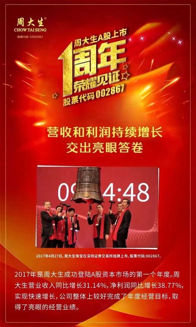 2017年4月27日,周大生(股票代码002867)在深圳证券交易所A股上市。2018年4月17日,周大生发布2017年年报,全年实现营业收入38.05亿元,同比增长31.14%,归属于上市公司股东的净利润5.92亿元,同比增长38.77%。