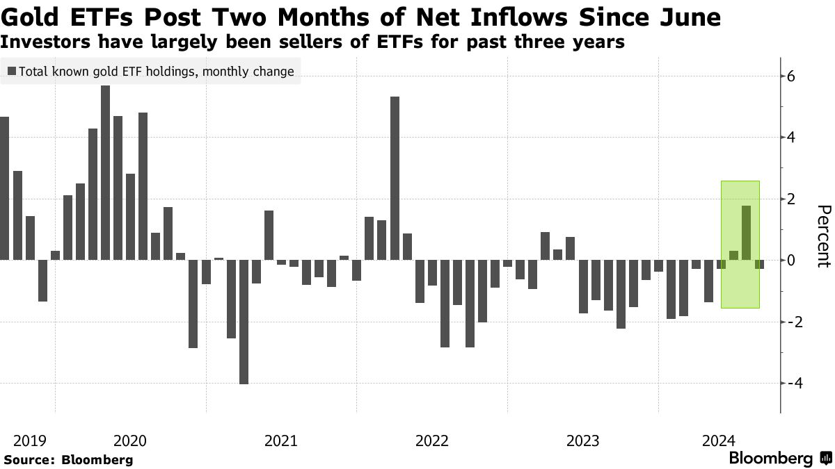 类似的情况可能也出现在黄金支持的交易所交易基金(ETF)中,最近几周有迹象显示ETF投资者出更大的兴趣。尽管金价在3月和4月大幅上涨,ETF的持仓仍然呈现净流出,到5月中旬全球ETF持仓量降至2019年以来的最低点。然而,从6月开始,趋势似乎有所转变,ETF连续两个月录得净流入。