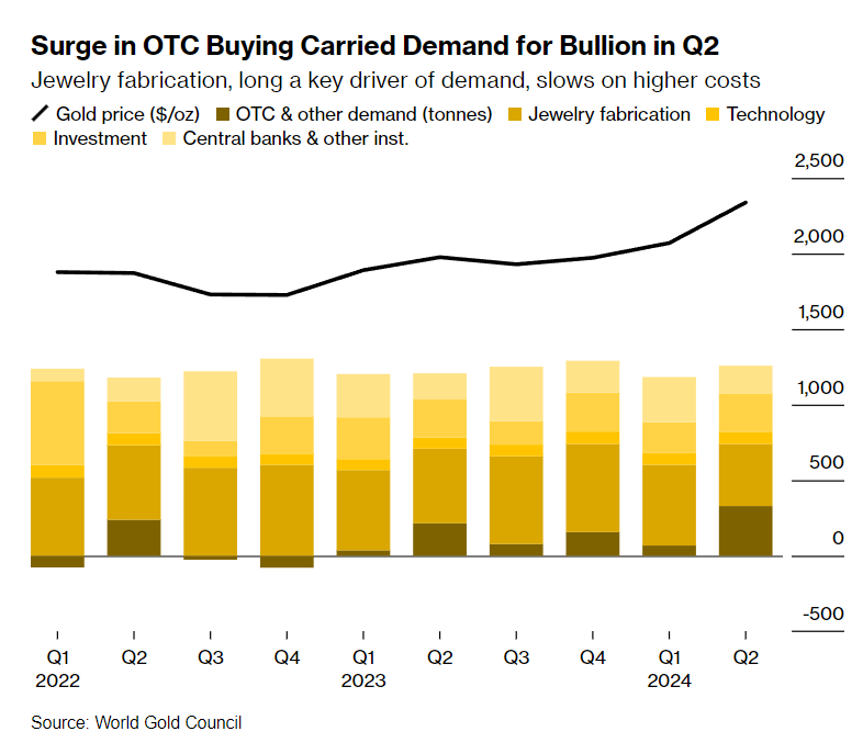 据世界黄金协会称,强劲的实物金条买盘,尤其是亚洲家族理财室的买盘,帮助黄金消费量创下至少25年来最好的第二季度。该协会表示,场外交易市场需求的进一步增长预计将成为金价上涨的关键推动力。