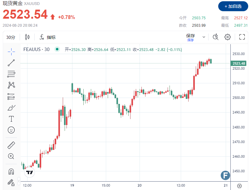 FX168财经报社(北美)讯 周二(8月20日),由于美元走弱以及西方投资者买盘推动黄金价格延续涨势,且市场预期美联储将在 9 月份降息,黄金价格创下历史新高。