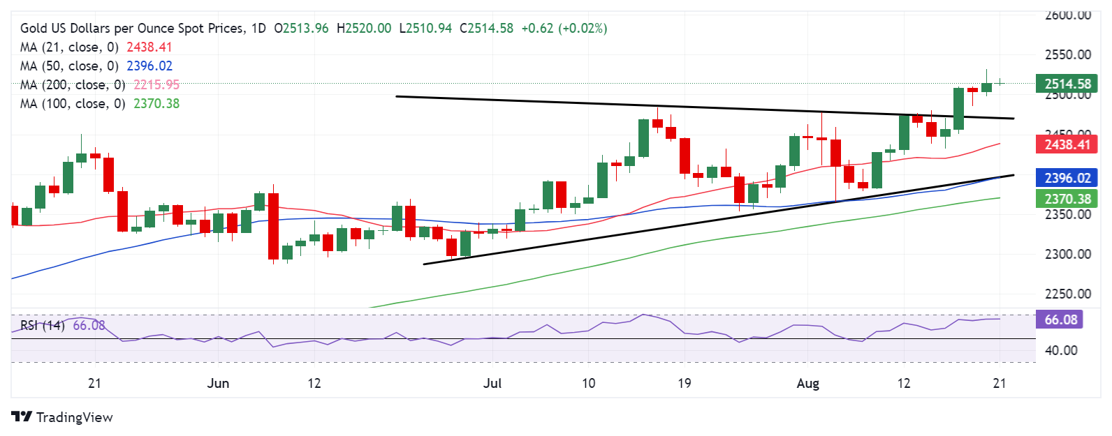 讯 周三(8月21日)欧市早盘,现货黄金维持日内反弹走势,目前金价位于2517美元/盎司附近。FXStreet高级分析师Dhwani Mehta周三最新撰文,对金价技术走势进行分析。