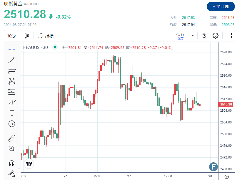 截至发稿,现货黄金下跌 0.32% 至 2,510.28 美元/盎司。美国黄金期货下跌 0.4% 至 2,545.40 美元盎司。