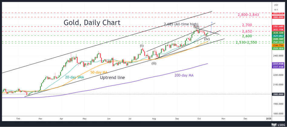 从技术角度来看,黄金的走势似乎符合一个看涨的1-5艾略特波浪模式。目前的回调可能是第4浪。如果价格跌破2600美元,可能会进一步下降至2530-2550美元的关键支撑区间,直至第5浪开始。