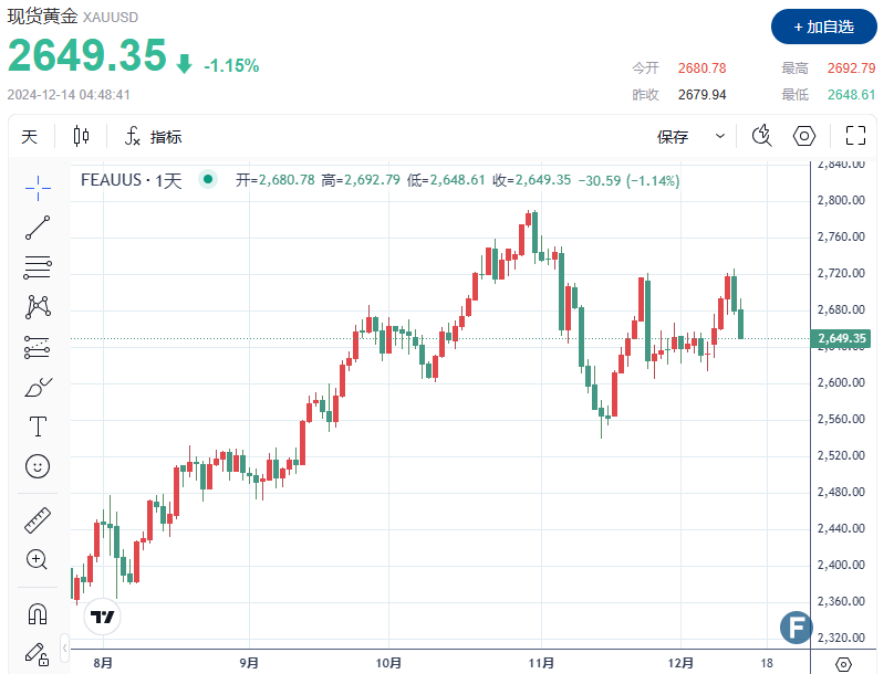 截至发稿,现货黄金下跌 1.15%,至每盎司 2,649.35 美元。但市场预期美联储下周仍将降息,金价本周上涨逾 0.8%。