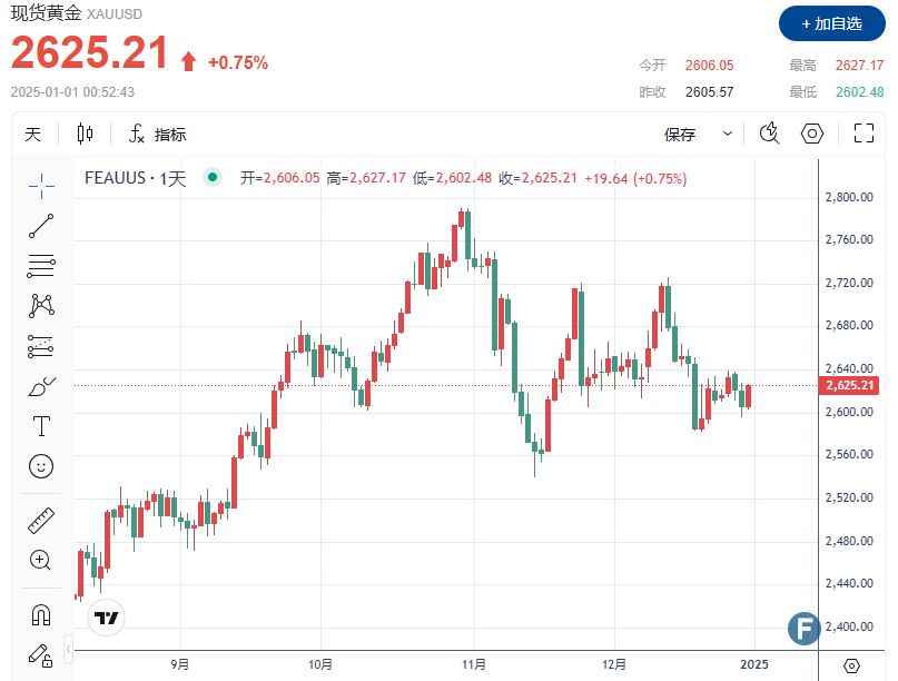 周二(12月31日),截至发稿,现货黄金上涨 0.75% 至每盎司 2,625.21 美元。
