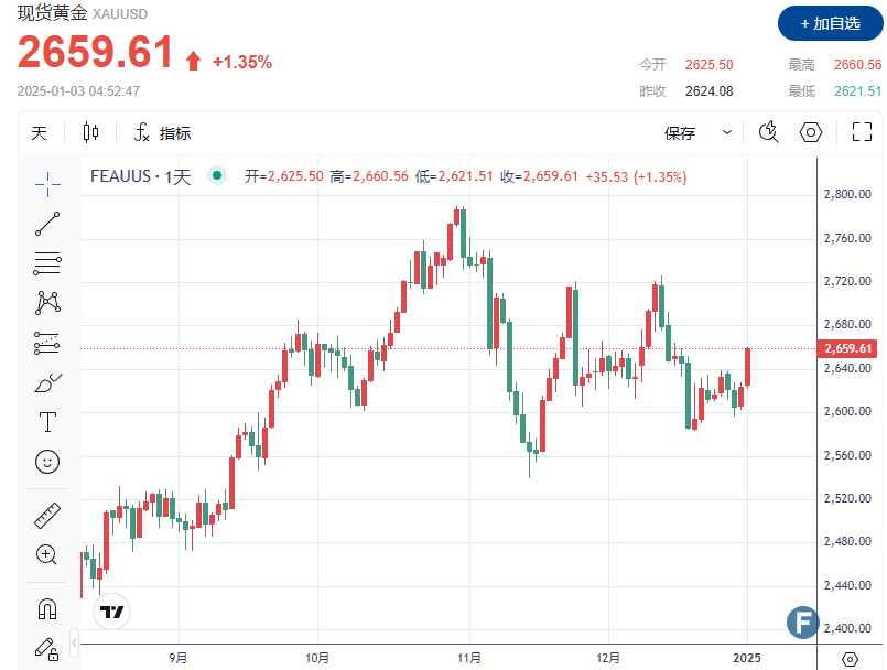 截至发稿,现货金上涨 1.35% 至每盎司 2,659.61 美元,创下去年 12 月 16 日以来的最高水平。