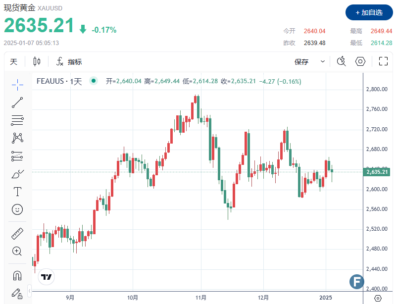 截至发稿,现货金下跌 0.17% 至每盎司 2,635.21 美元。