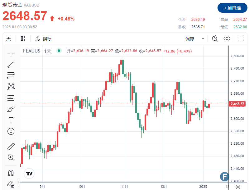 截至发稿,现货金上涨 0.48% 至每盎司 2,648.57 美元,盘中早些时候曾上涨至 2,660 美元上方。