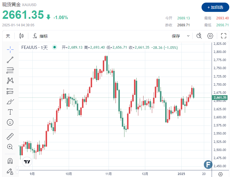 截至发稿,现货金下跌 1.06% 至每盎司 2,661.35 美元,盘中早些时候曾一度下跌至 2,656.71 美元。上周五,金价创下一个月以来的最高水平。