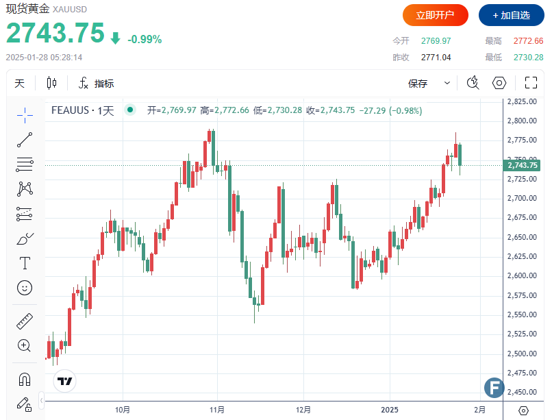 截至发稿,现货黄金下跌0.99%,报每盎司2,743.75美元,盘中一度逼近2,730美元关口。