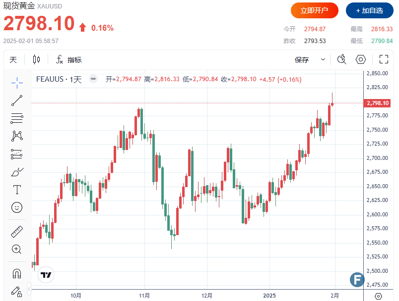 FX168财经报社(北美)讯 周五(1月31日),黄金创下历史新高,突破2,815美元/盎司。高盛分析师重申其对黄金的看涨观点,认为美国对墨西哥和加拿大的关税威胁以及债务风险将继续支撑金价上行。