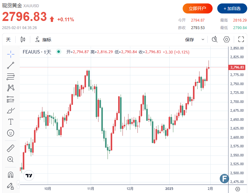 FX168财经报社(北美)讯 周五(1月31日),国际金价冲高回落、但仍交投于2800美元附近。此前,白宫纠正了路透社关于美国推迟对加拿大和墨西哥关税至3月1日的报道,确认25%关税仍将在2月1日生效,引发市场震荡。