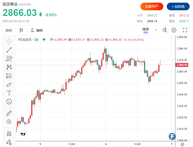 截至发稿,现货黄金微跌0.03%,至每盎司2,866.03美元,此前周三曾触及历史新高2,882.16美元。