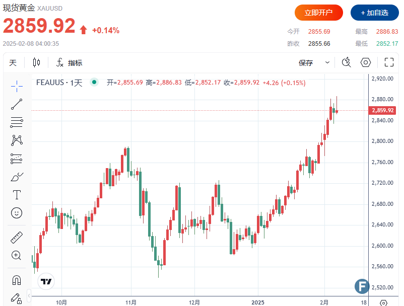 受此影响,金价回吐了此前涨幅,较早些时候在美国交易时段创下的2,886.83美元/盎司历史高位回落。截至发稿,现报2,859.92美元/盎司。