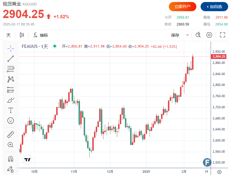 FX168财经报社(北美)讯 周一(2月10日),黄金价格飙升再次创下历史新高,原因是美国总统唐纳德·特朗普(Donald Trump)宣布新的关税计划后,市场对全球贸易战的担忧加剧,避险需求激增。