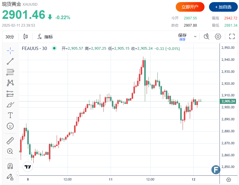 截至发稿,现货黄金下跌0.22%至每盎司2,901.46美元,此前一度触及2,942.72美元的历史高点。