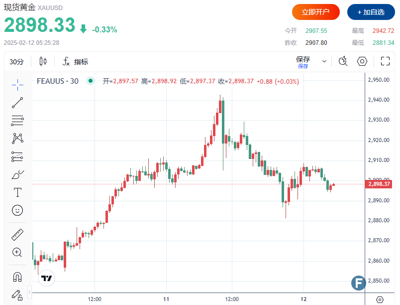 截至发稿,现货金下跌 0.33% 至每盎司 2,898.33 美元,盘中早些时候曾触及 2,942.70 美元的高点。