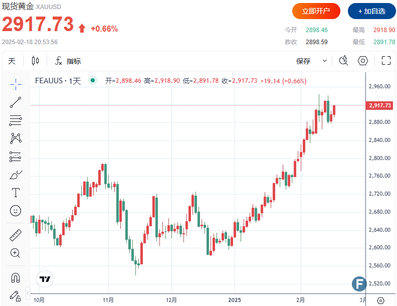 截至发稿,现货黄金上涨0.6%,报2,917.73美元/盎司,相比上周创下的2,942.70美元/盎司历史高点仍有一定回落。