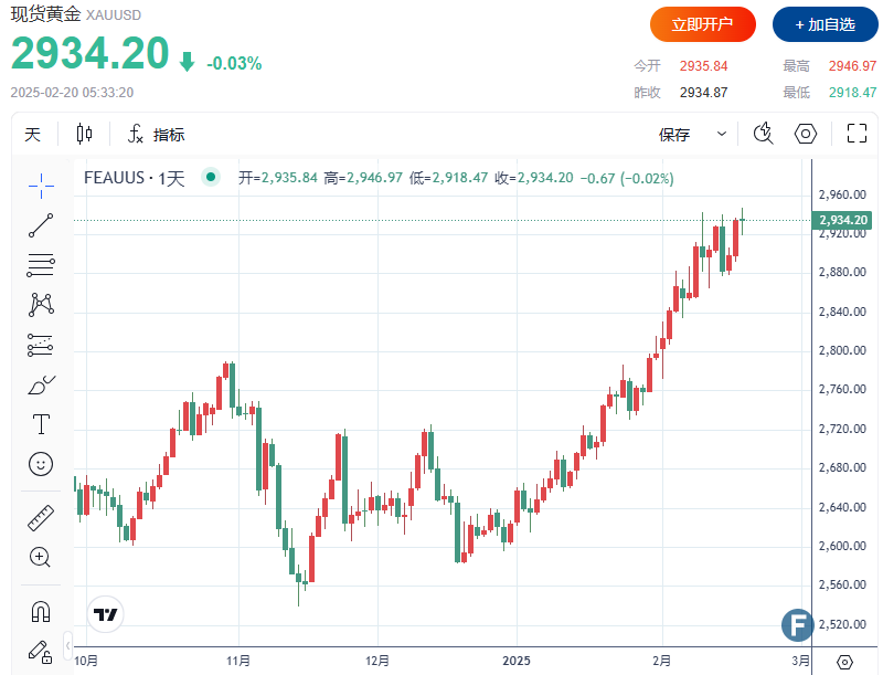 截至发稿,现货黄金下跌0.03%,报2,934.20美元/盎司。金价盘中最高触及2,946.97美元/盎司。